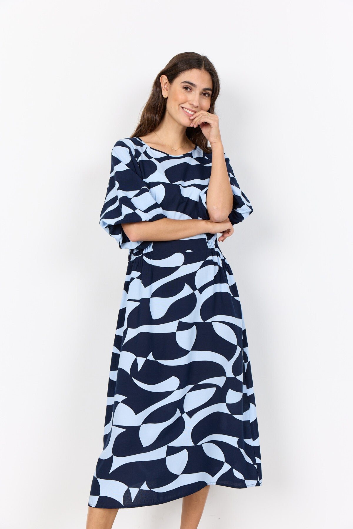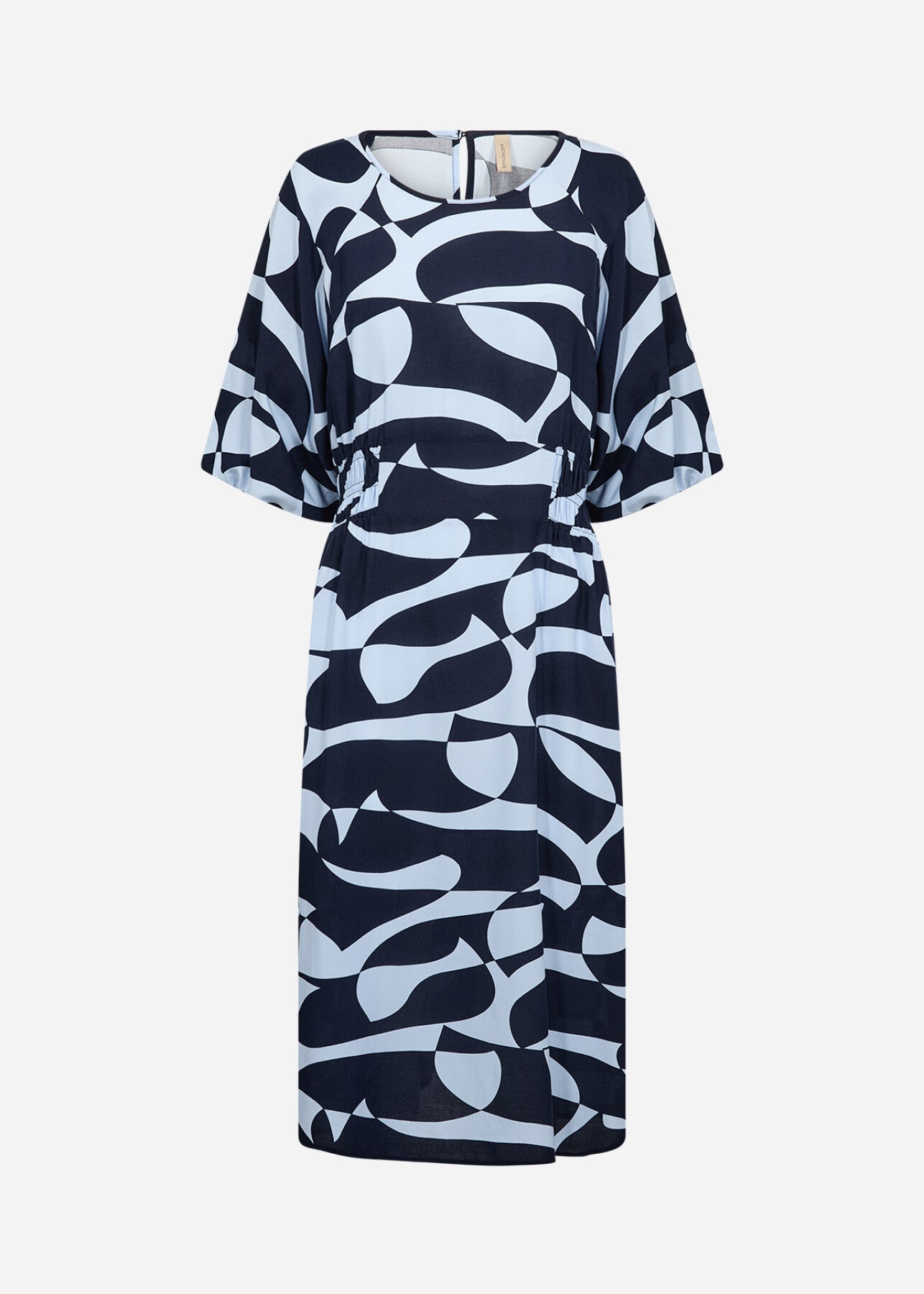 Das SC-CHANISE 4 Kleid ist aus 100% LENZING™ ECOVERO™ Viskose gefertigt. Es hat einen Rundhalsausschnitt, kurze Ärmel und einen auffälligen abstrakten Druck, der für einen mutigen Akzent sorgt. Kombinieren Sie dieses einzigartige Kleid mit neutralen Sandalen oder eleganten Flats für einen stilvollen Look.